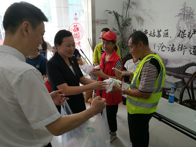 活动最后酒管系(三元宾馆)党总支将准备好的三十多份的毛巾、花露水等防暑用品和宾馆自制的冰镇柠檬酸梅汤一一送到现场参加劳动的党员志愿者们手中,向大家表示亲切慰问和感谢。金狮社区樊书记等工作人员和党员志愿者们感谢酒管系(三元宾馆)党总支的积极参与,还在炎炎夏日为他们送去清凉和问候,纷纷表示要将城市环境“百日行动”进行到底,还城市和居民洁净市容。
