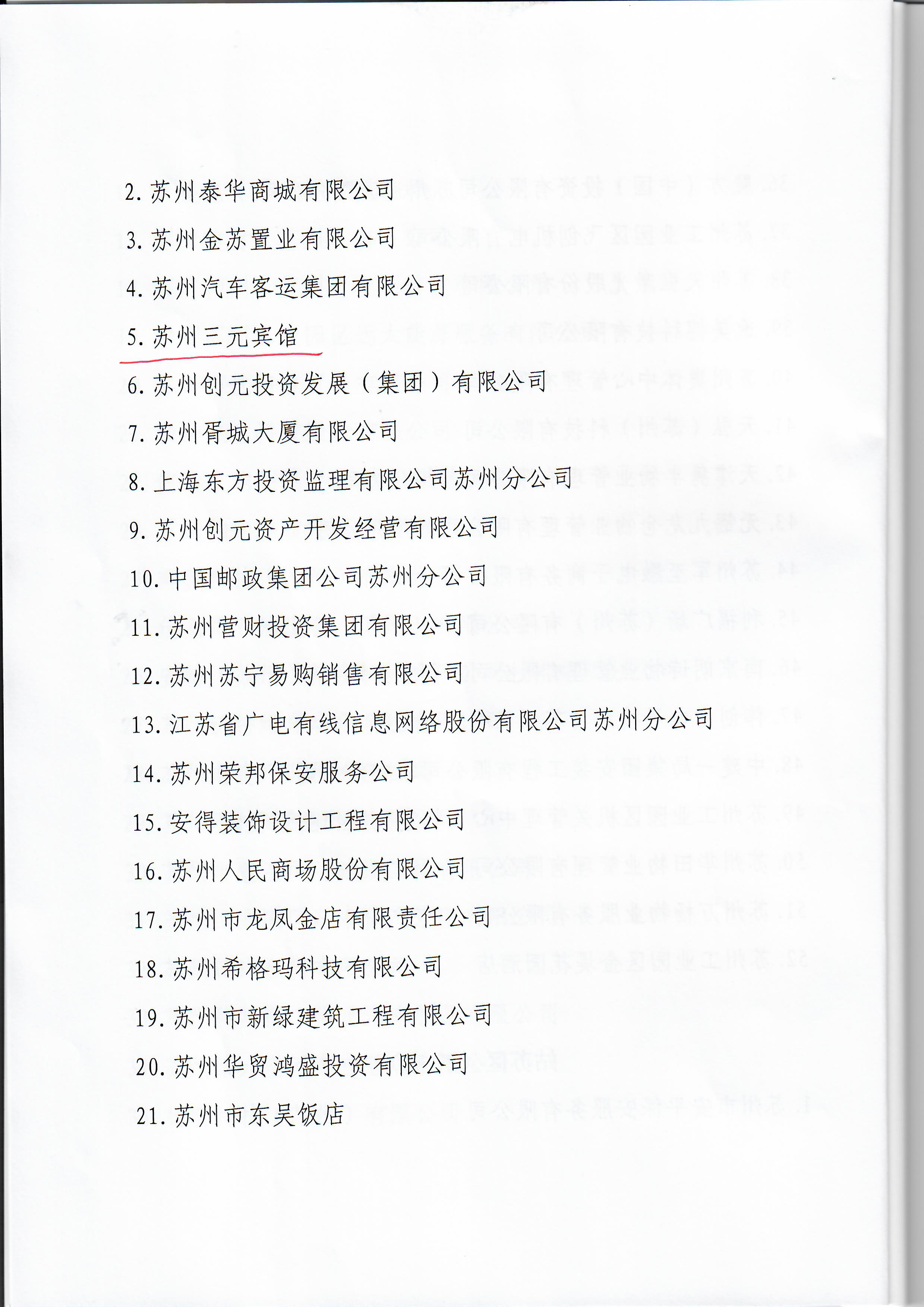 近日,苏州市“平安企业”创建活动领导小组发布关于表彰2019年度“平安企业”创建工作先进集体的通知(苏平发【2019】2号),三元宾馆被评为2019年度“平安企业”创建工作先进集体,并授予苏州市级“平安企业”荣誉称号,该荣誉的获得是对三元宾馆2019年度安全管理工作的充分肯定。